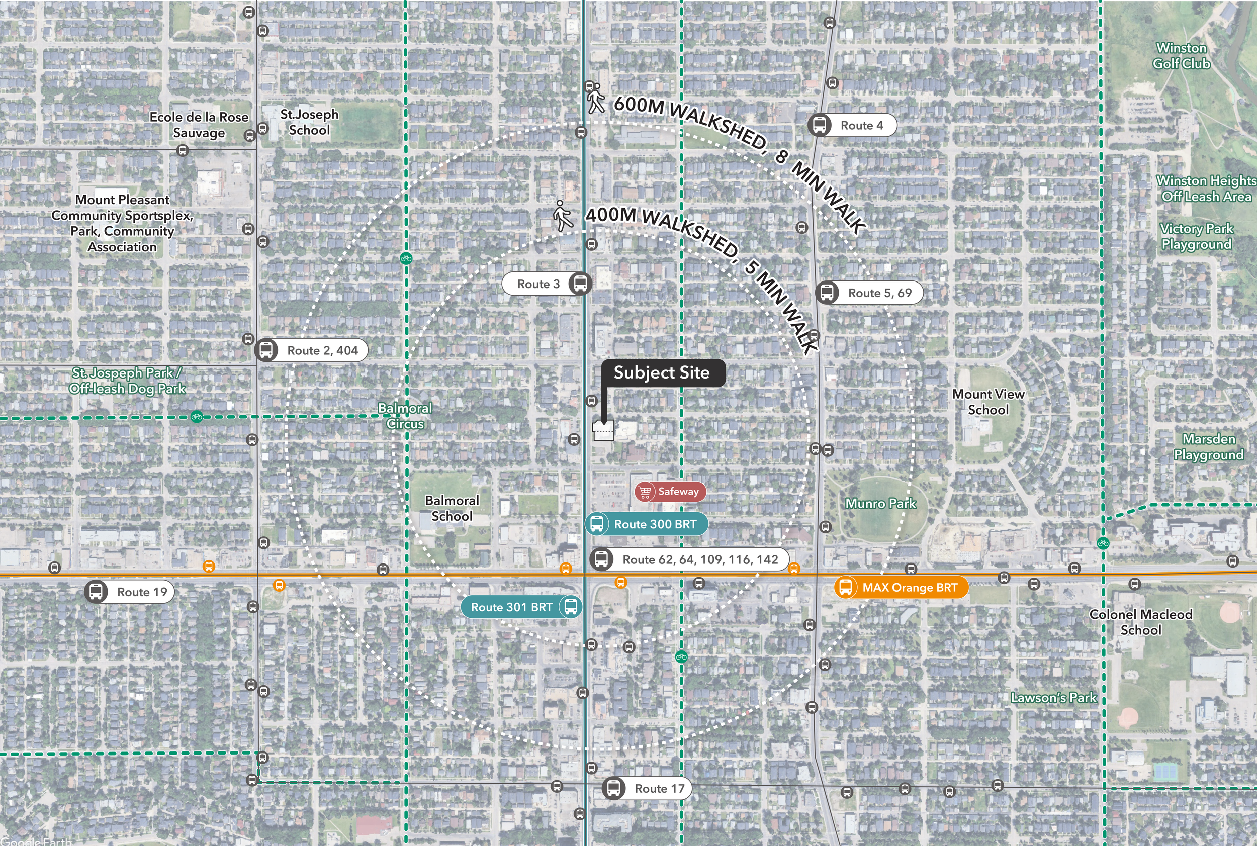 The site’s strong connections to the broader road, transit, and active mobility networks make it well-positioned to accommodate new residential and commercial-retail uses. Vehicle access will be provided via the rear laneway, while pedestrian access to the building and storefronts is oriented toward Centre ST N and 19 AV NE, reinforcing a pedestrian-friendly, street-facing interface along Centre ST N.