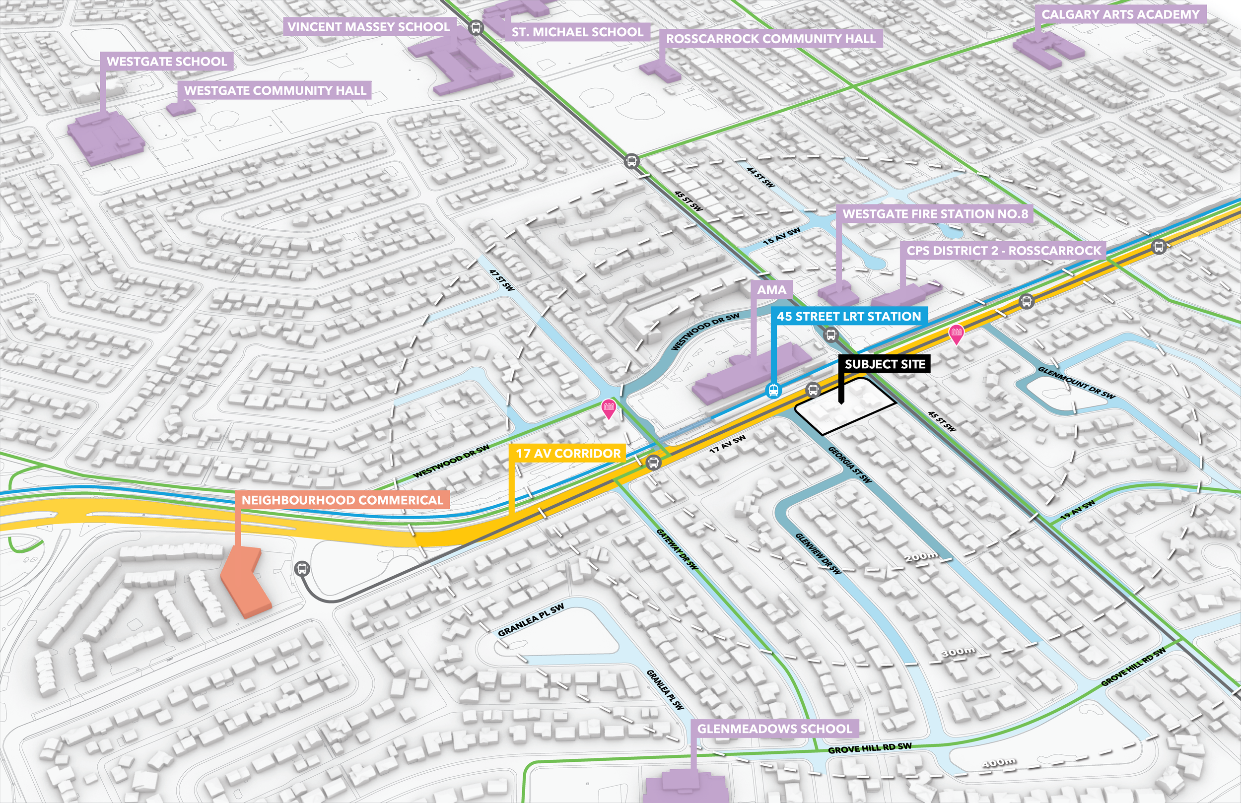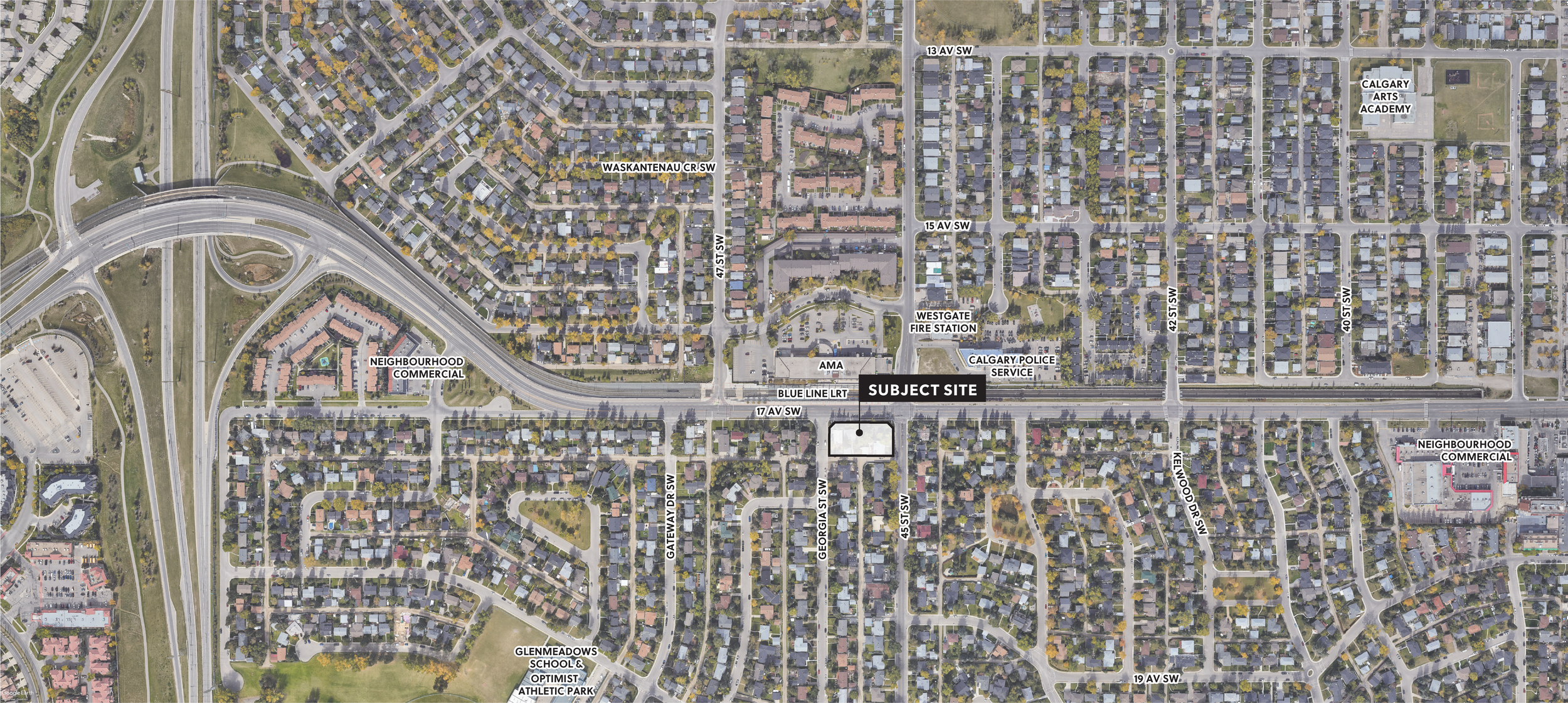 The subject site has a high opportunity for growth and redevelopment, exhibiting a number of contextual factors that support the proposed intensification through a mixed-use, six-storey built form. The site benefits from the strategic location along 17 Avenue SW directly adjacent to the 45 ST SW Blue Line LRT Station, as well as nearby to numerous amenities within the Westgate, Glendale, and Rosscarrock communities.