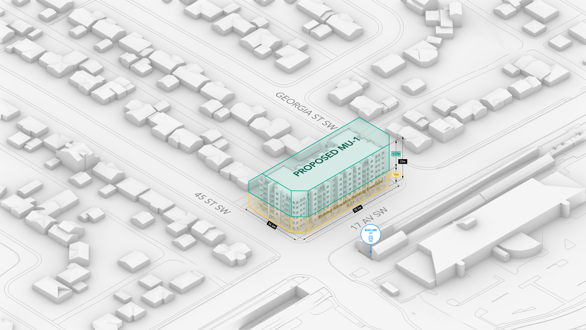 To support the redevelopment vision for The Vibe, a Land Use Redesignation from Residential - Contextual One Dwelling (R-C1) to Mixed Use - General (MU-1f4.0h22) is proposed. This would allow for a street oriented multi-residential development of up to 22 metres in height (six storeys) and a Floor Area Ratio (FAR) of 4.0. The Mixed-Use Land Use District within LUB1P2007 was specifically designed to support growth in key areas, including Transit Oriented Development zones such as the 45 ST SW Station Area.